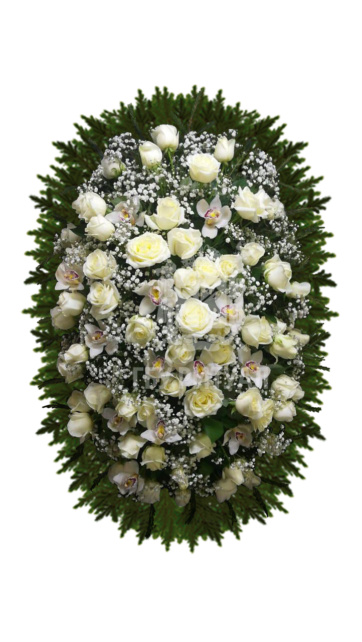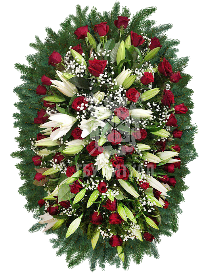 Цветочные медальоны. Так называют цветочные композиции, предназначенные для размещения на крышке гроба. Чаще всего их используют при закрытом гробе, согласно католическому обряду, или при проведении кремации. Оригинальная цветочная композиция позволяет присутствующим на церемонии не акцентировать внимание на невозможности личного прощания с покойным.